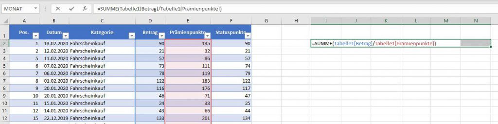 =SUMME(Tabelle1[Betrag]/Tabelle1[Prämienpunkte])