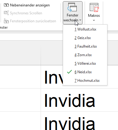 Aber: Da in der Registerkarte Ansicht im Symbol „Fenster wechseln“ die Dateinamen alphabetisch sortiert sind, fand sie diese Lösung sehr attraktiv: