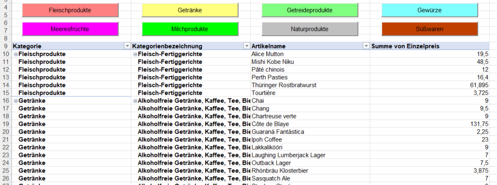 In einem größeren Excel-Projekt sollen Daten zusammengefasst werden. Das kann man wunderbar mit einer Pivottabelle erledigen. Und über der Tabelle sollen sich Schaltflächen befinden, über welche man die Tabelle filter kann.