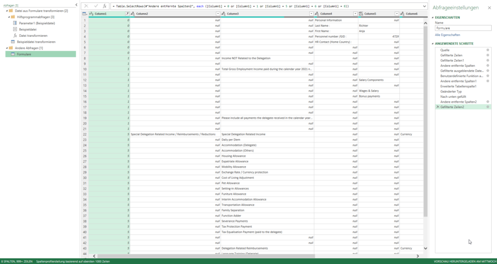 Wir wissen, dass PowerQuery zu Beginn nur 1.000 Zeilen auswertet. Bei 50 Formularen x zirka 150 Zeilen sind das 7.500 Zeilen. Okay – ich lasse ALLE Zeilen auswerten, indem ich auf der Statuszeile von 1.000 auf „alle“ wechsle: