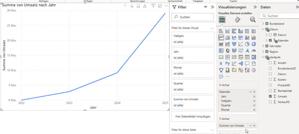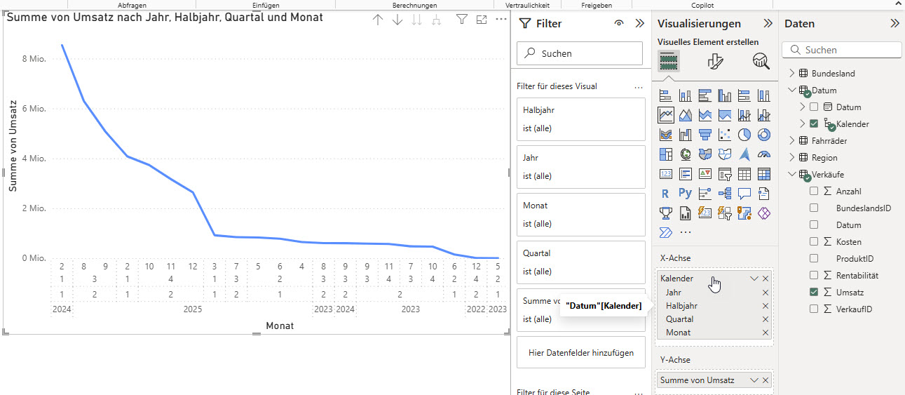 Zieht man in PowerBI in das Visual „Liniendiagramm“ zuerst“ eine Kalenderhierarchie (also Jahr, Halbjahr, Quartal, Monat, …) und anschließend einen Wert, dann sieht das Ergebnis so aus: