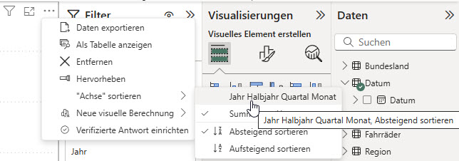 Eigentlich nicht schlimm, denn man kann nach der X-Achse sortieren lassen. Hierfür stehen die drei Pünktchen am oberen, rechten Rand des Visuals zur Verfügung: