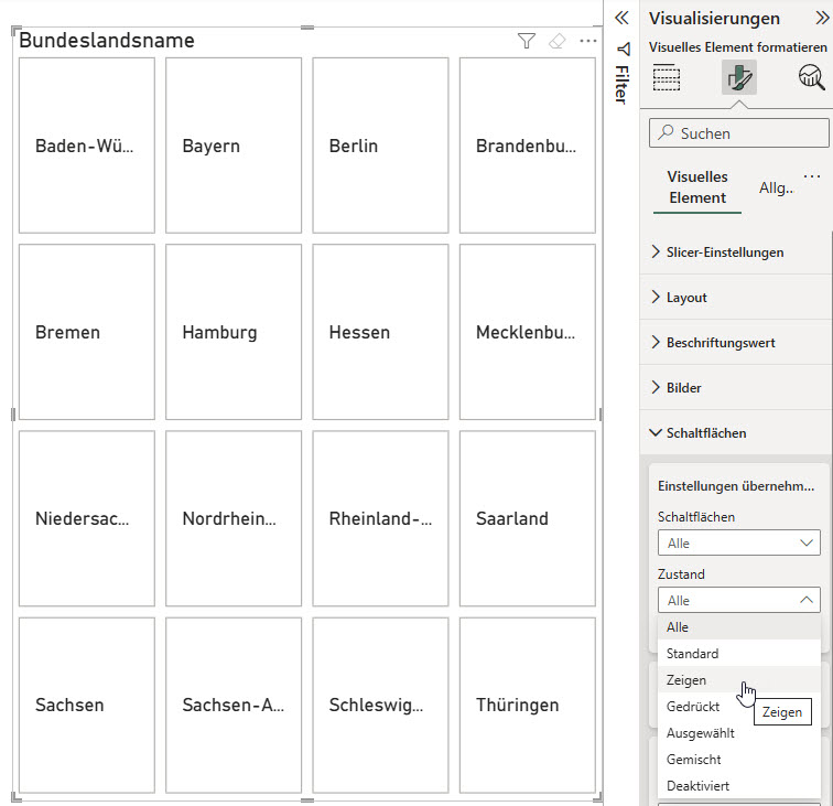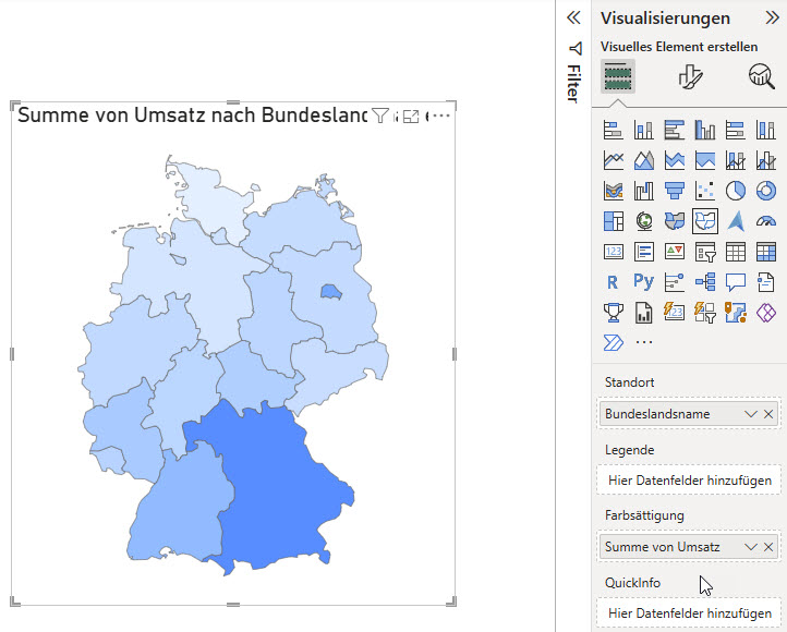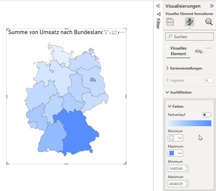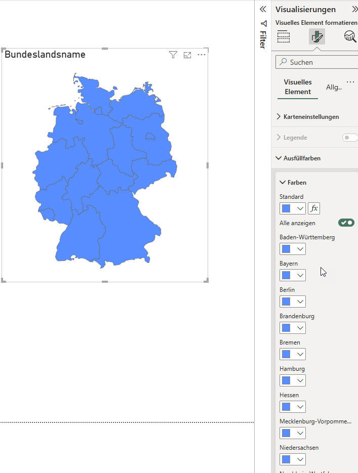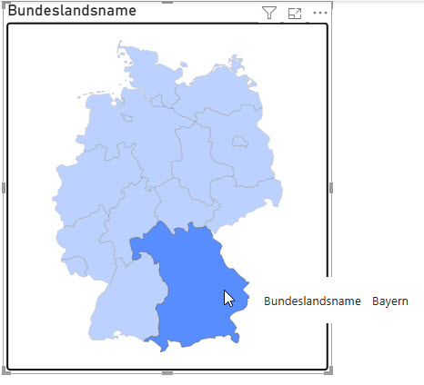 Frage eines Teilnehmers in der PowerBI-Schulung: Kann man die Farben des Visuals „Formenkartogramm“ (ein Vorschaufeature) ändern? Die Grundfarben, die Farben für nicht selektiert, die Farbe, wenn der Mauszeiger darüber fährt?