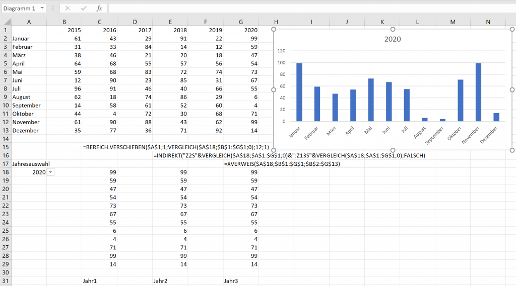 Die Antwort: Über ein Dropdownfeld in Zelle AB12 wird das Jahr ausgewählt. In Zelle AC12 wird mit einer Formel die Zeile berechnet, aus der Daten gezogen werden. Im Register Formeln / Definierte Namen / Namensmanager werden zwei Namen definiert („Frauen“ und „Männer“), die ausgehend von A1 einen Bereich berechnen, der um so viele Zeilen nach unten versetzt liegt wie in AC12 berechnet wurde. Diese beiden Bereiche wurden nun im Exceldiagramm verwendet, so dass der Anwender das Jahr auswählen kann und das Diagramm dynamisch den Bereich darstellt. Erstaunlicherweise kann Excel diese Formel in der Datenquelle nach einem erneuten Öffnen nicht mehr anzeigen.