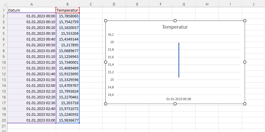 Der Grund: Excel erkennt die erste Spalte als Datum, hat jedoch als kleinste Einheit nur Tage zur Verfügung (deshalb bei Ihnen auch die Tagessprünge).