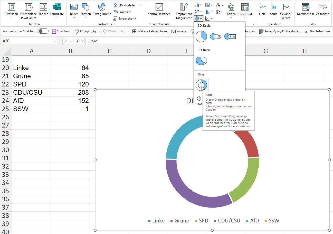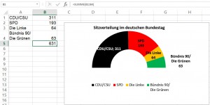 Irgendwie doof. Ich möchte gerne die Sitzverteilung des deutschen Bundestages, der vor zwei Tagen gewählt wurde, in einem Kreisdiagramm (Ringdiagramm) darstellen.