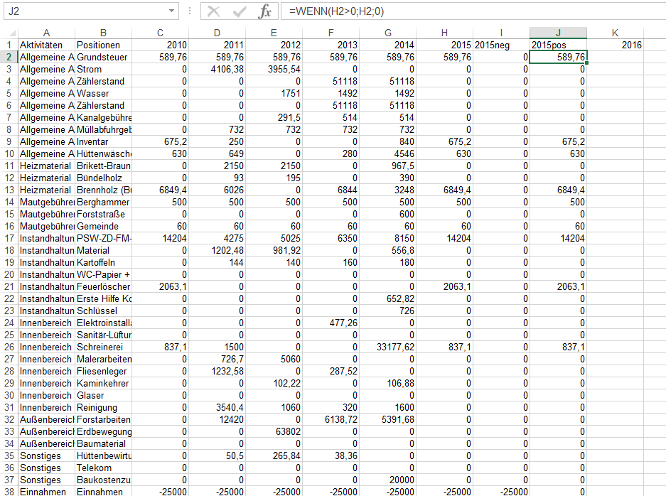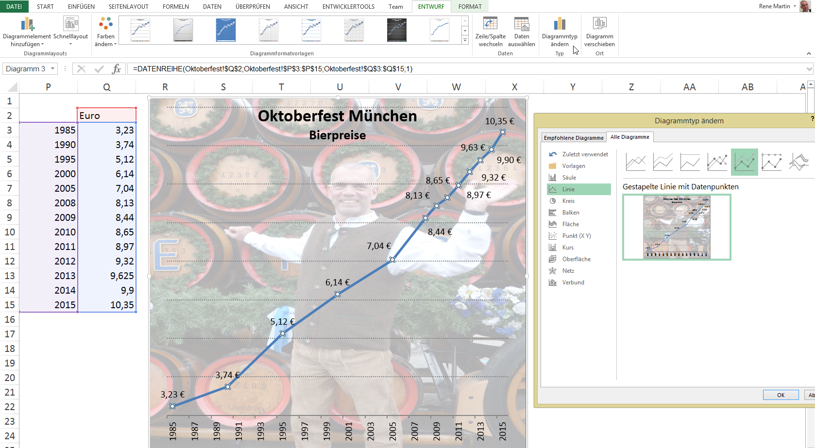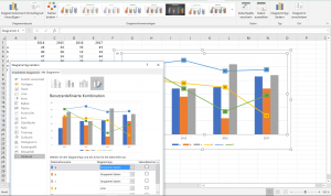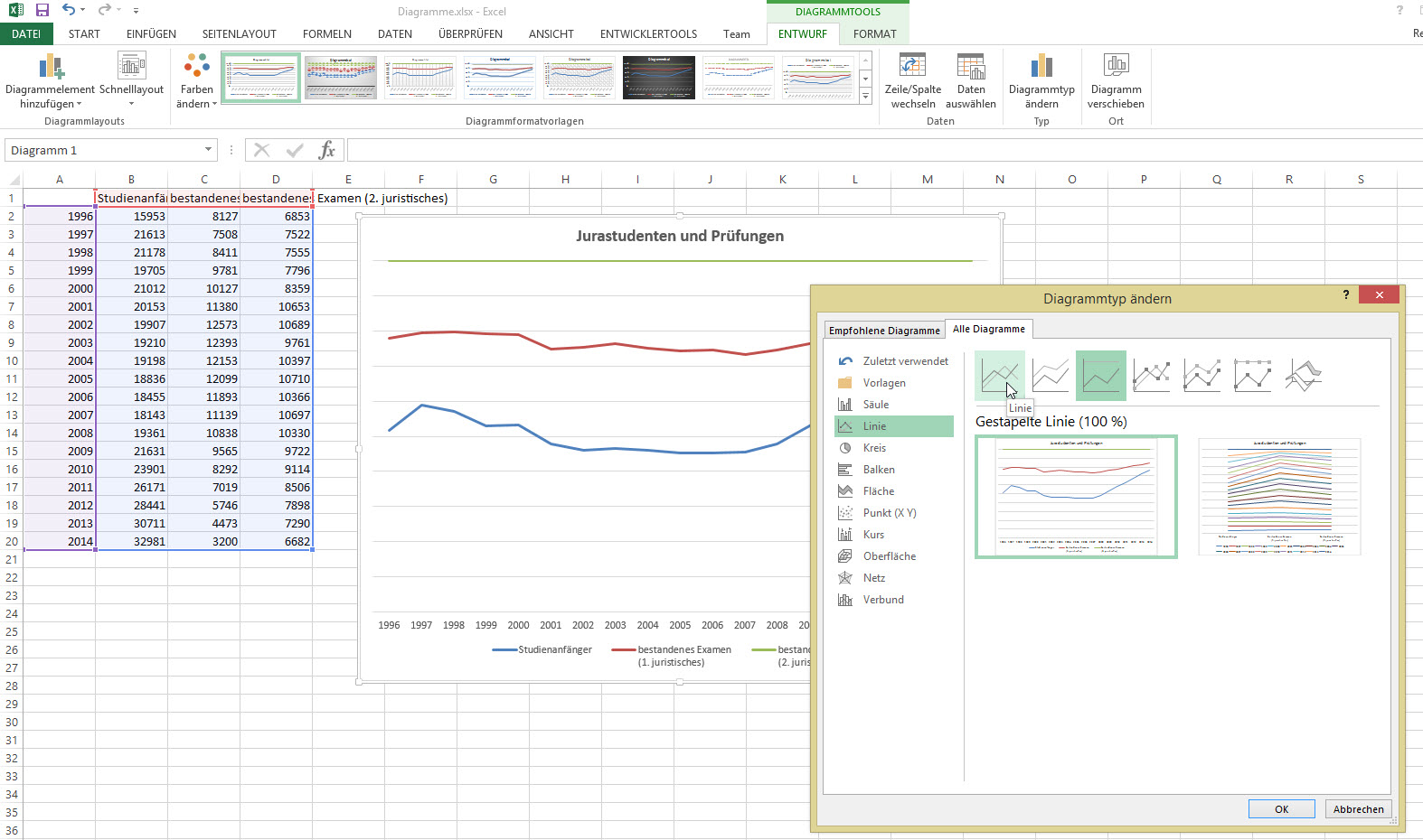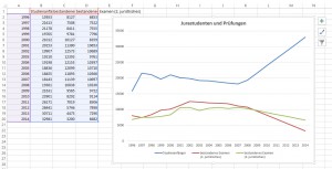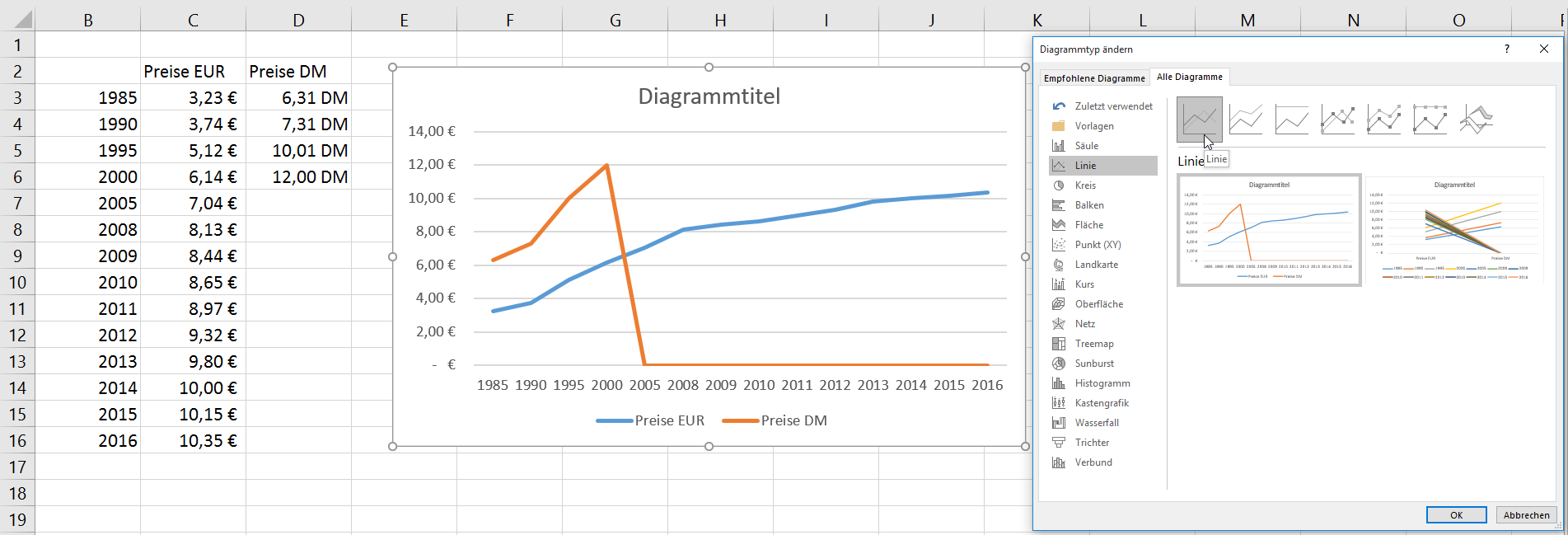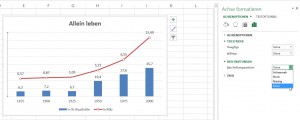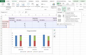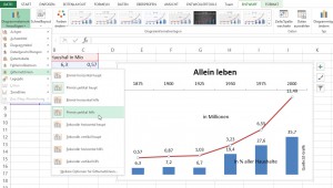 Die Antwort: Sie tun sich leichter, wenn eine Kategorienspalte aus Zahlen (hier: Jahreszahlen) besteht und wenn über dieser Spalte keine Überschrift steht; jedoch über den anderen Spalten. Dann interpretiert Excel die erste Spalte als Kategorie und nicht als Wert – was viel Nacharbeit erspart.
