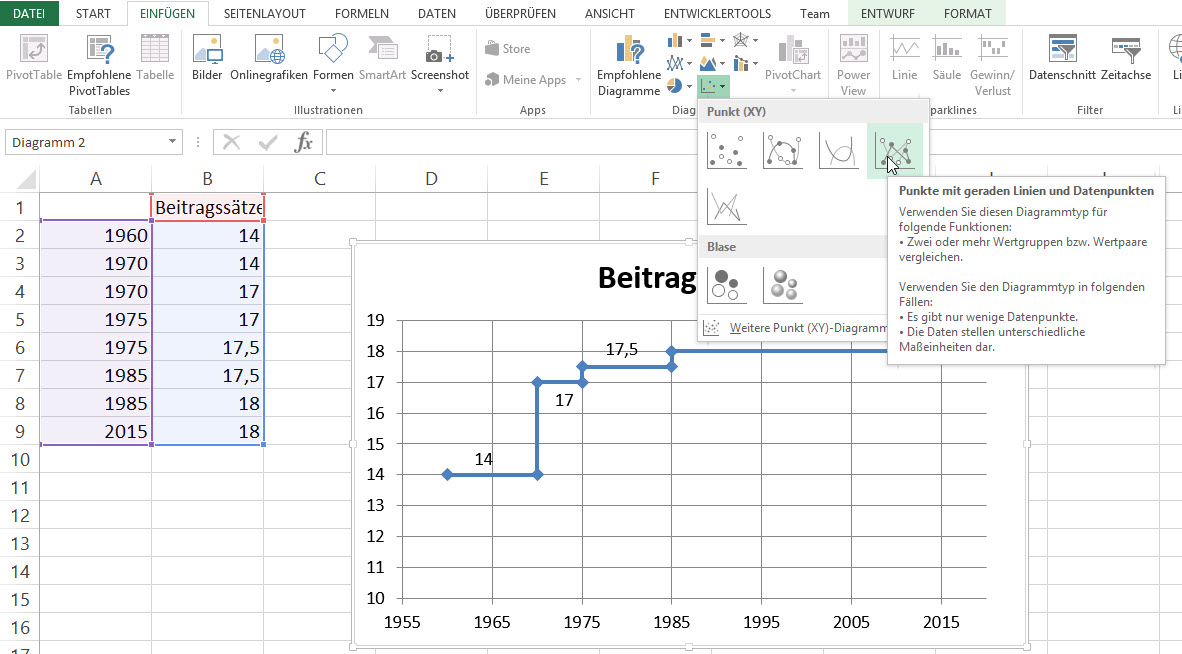 Kann man in einem Liniendiagramm waagrechte Linien erzeugen? Wenn man beispielsweise darstellen möchte, dass ein Beitragssatz oder Prozentsatz vom Jahr x bis zum Jahr y unverändert geblieben ist?