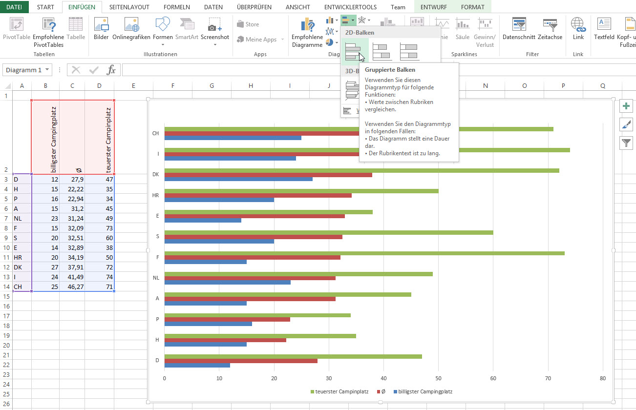 1. Tragen Sie die Daten ein. Wählen Sie ein 2D-Balkendiagramm mit gruppierten Balken: