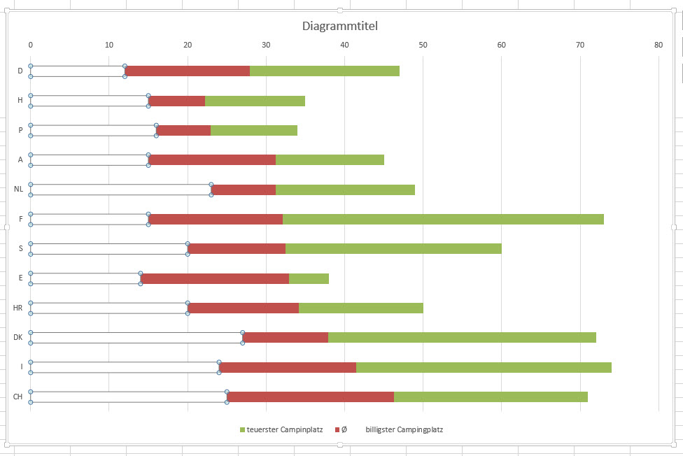 Ich habe vor Kurzem ein interessantes Diagramm gesehen. Dort laufen Balken von einem Wert bis zu einem Wert, das heißt sie bestimmen die Spanne. Auf den Balken befinden sich Länderkennzeichen, die die gewichtete Mitte darstellen. Kann man das in Excel realisieren?