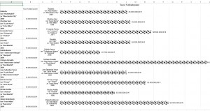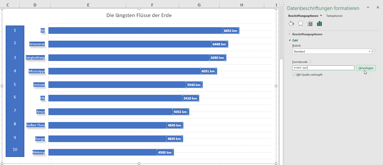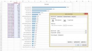 Die Antwort: Schreiben Sie Ihre Liste „kompakt“ – das heißt: ohne Leerzeilen und ohne Leerspalten. Dann kann man leichter ein Diagramm erstellen. Kümmern Sie sich nicht darum, dass vielleicht einige der Texte in der Tabelle nicht angezeigt werden – Excel übernimmt schon den kompletten Text in die Diagramme: