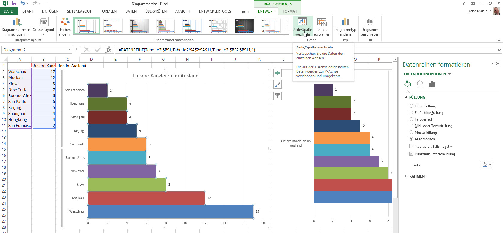 Die Antwort: Es handelt sich hierbei um zwei verschiedene Diagramme. Beim rechten wurden Zeilen und Spalten vertauscht. Das linke sieht ähnlich aus wie das erste, weil dort die Datenpunkte einzeln formatiert wurden (Punktfarbunterscheidung).
