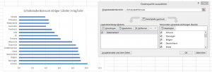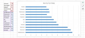 Die Aura ist okay, aber die Daten sind es nicht. Sie haben in der Rubrik Irland nicht die Zahl 8,8 eingegeben, sondern 8,8, – dieser Wert wird von Excel nicht als Zahl verstanden und deshalb als Text interpretiert. Und nun geht Excel davon aus, dass die ersten fünf Zeilen Überschrift sind und schreibt diese als Überschrift über das Diagramm und beginnt erst ab GB die Daten im Diagramm darzustellen. Vielleicht haben Sie es nicht gleich gesehen, weil die Spalte, in der die Zahlen stehen, so schmal ist.