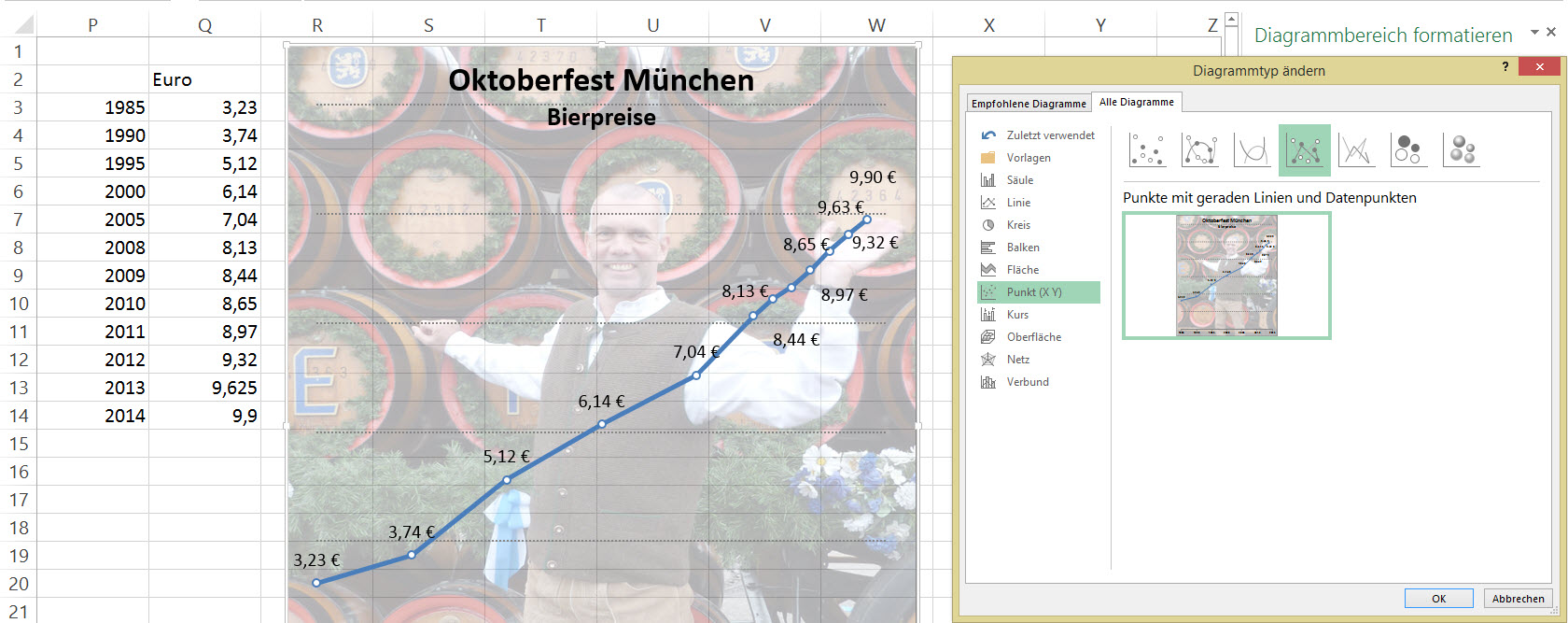 Die Antwort: Wenn Sie das Diagramm markieren und über Entwurf / Daten / Diagrammtyp ändern nachsehen, dann stellen Sie fest, dass es hierbei nicht um ein xy-Diagramm handelt, sondern um ein Balkendiagramm. Am Ende der Balken werden die Noten als Wert angezeigt und die Balken transparent formatiert.