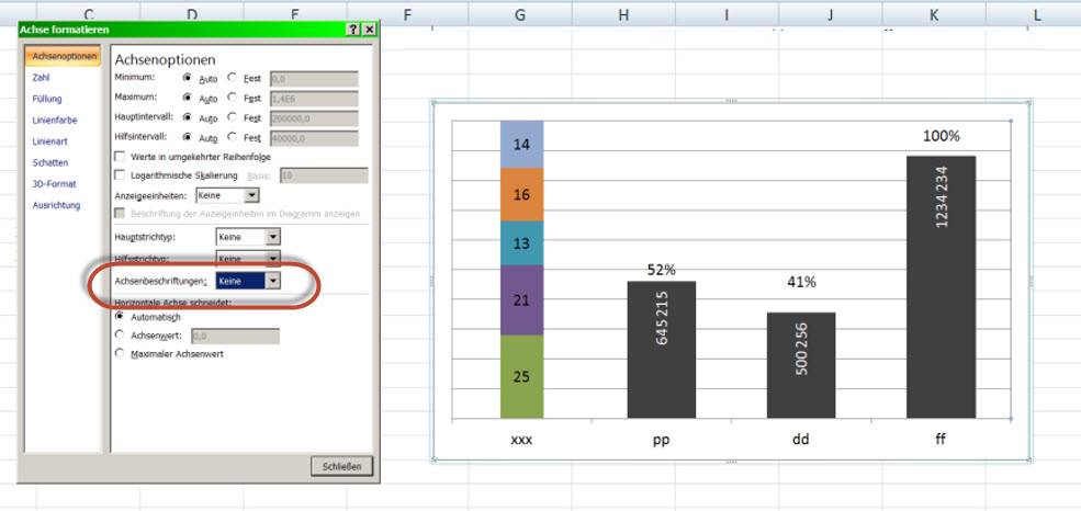 Die Lösung: Man darf sie nicht löschen, sondern muss sie „wegformatieren“, das heißt die Linie transparent formatieren und die Beschriftung und Teilstriche ausschalten. Dann funktioniert es.