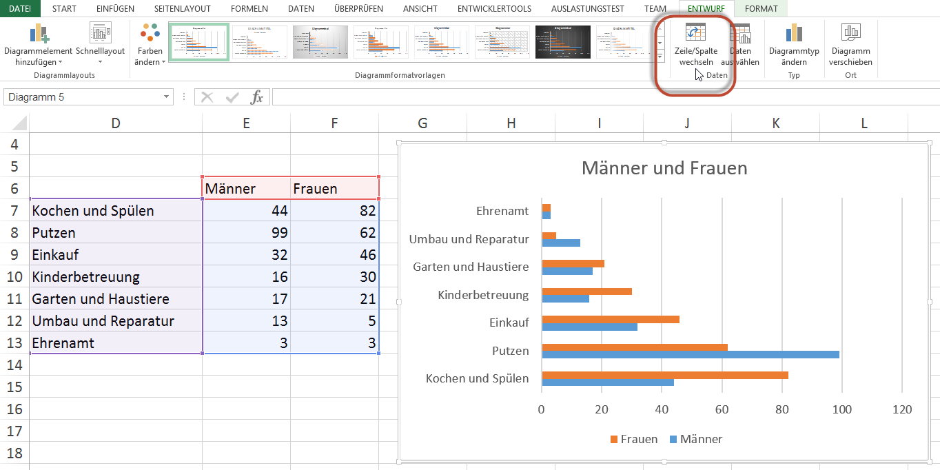 4. Schieben Sie den hinten liegenden Balken nach vorne, indem Sie Entwurf / Daten / Daten auswählen die Daten „nach unten“, beziehungsweise „nach oben“ schieben.