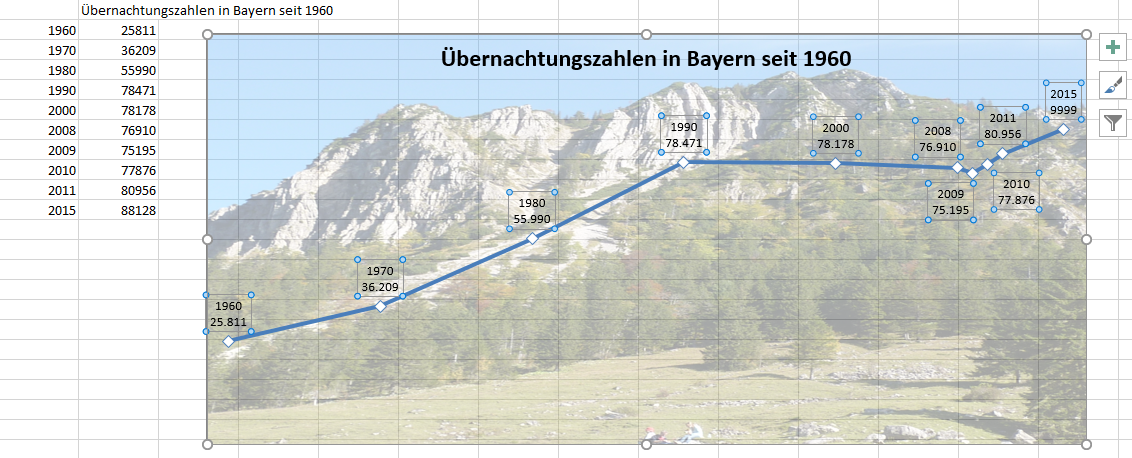 Die Antwort ja – wenn man die Daten geschickt einträgt – für jedes Jahr den Wert den er bis zum Sprung und nach dem Sprung gemacht hat. Und zusätzlich ein XY-Diagramm verwendet.