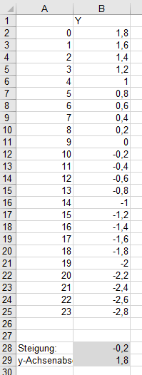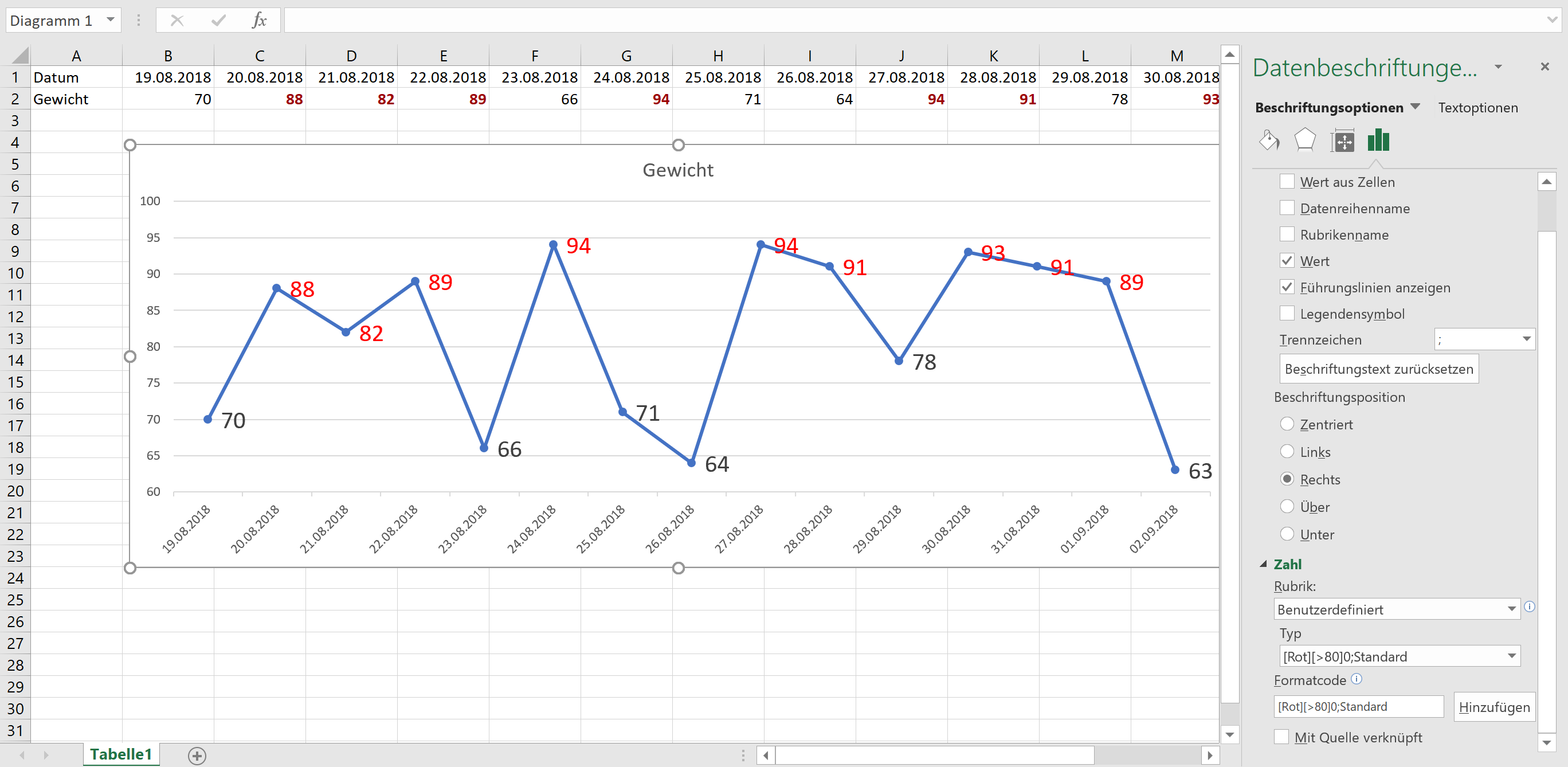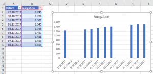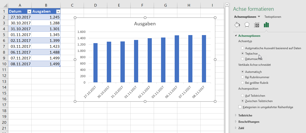 Steht in einer Spalte eine Datumsangabe und daneben eine Zahl wird das Datum als Achsenbeschriftung erkannt – obwohl es sich hierbei eigentlich auch um eine Zahl handelt.