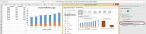 Die Antwort: Über ein Dropdownfeld in Zelle AB12 wird das Jahr ausgewählt. In Zelle AC12 wird mit einer Formel die Zeile berechnet, aus der Daten gezogen werden. Im Register Formeln / Definierte Namen / Namensmanager werden zwei Namen definiert („Frauen“ und „Männer“), die ausgehend von A1 einen Bereich berechnen, der um so viele Zeilen nach unten versetzt liegt wie in AC12 berechnet wurde. Diese beiden Bereiche wurden nun im Exceldiagramm verwendet, so dass der Anwender das Jahr auswählen kann und das Diagramm dynamisch den Bereich darstellt. Erstaunlicherweise kann Excel diese Formel in der Datenquelle nach einem erneuten Öffnen nicht mehr anzeigen.