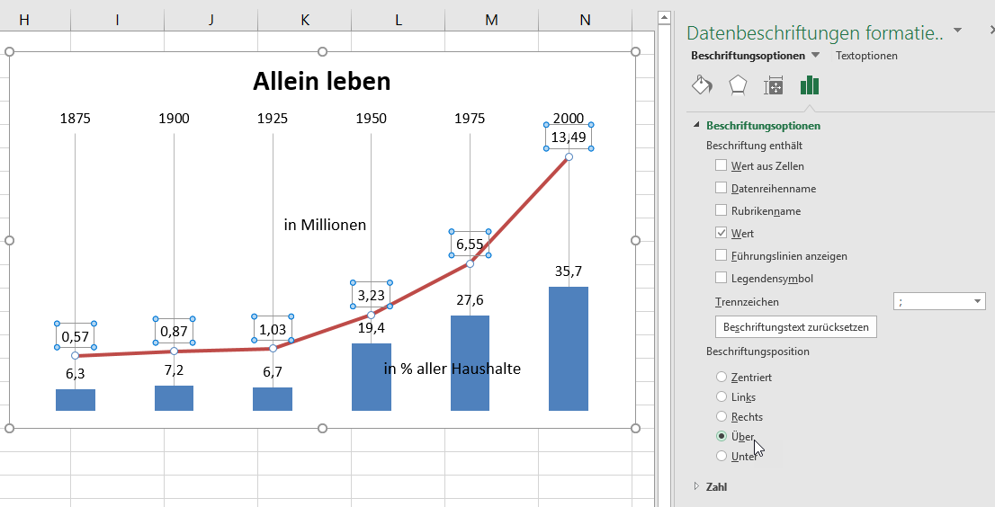 Zugeben: die Jahreszahlen muss man „rechtsbündig“ formatieren, dann sieht es so aus, als wären die Zahlen in der Mitte der Säulen.