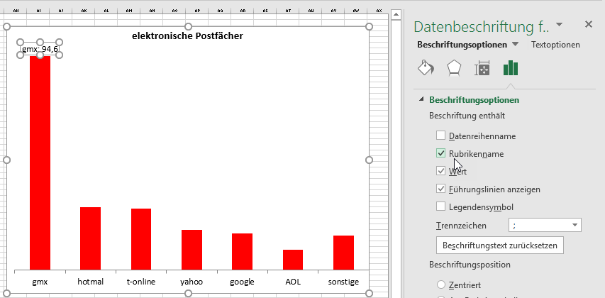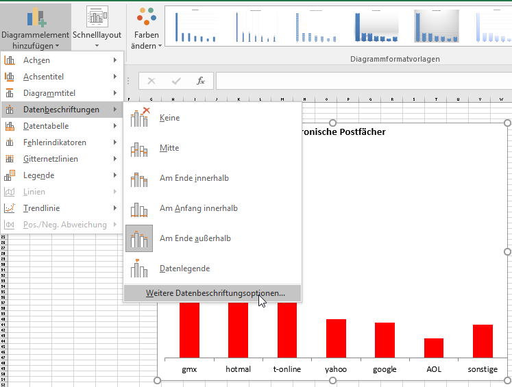 Die Antwort: Sie haben die falsche Variante verwendet. Sie haben zwar nur eine Datenreihe, haben aber dennoch „gestapelte Säulen“ verwendet. Auch wenn es auf den ersten Blick ähnlich aussieht wie die Option „gruppierte Säulen“ gibt es einige, kleine Unterschiede. Excel „vermutet“, dass noch eine zweite Säulenreihe auf die erste platziert wird und verbietet deshalb das Positionieren der Zahlen über den Balken.