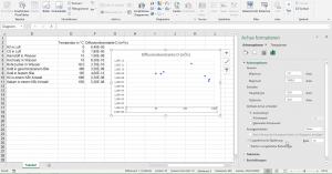 Dann wollten wir für ein 2. Diagramm eine andere Spalte als X-Achse nehmen (Spalte I). Excel erstellte nun aber nicht ein Punktdiagramm, welches die beiden Datenreihen als X-Y-Kombination zeigte, sondern „zählte“ sozusagen hoch, begann bei 1 und endete bei 54 (Ende der Datenreihe).