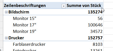 3.) indem man den Cursor NEBEN die Pivottabelle setzt und den Filter einschaltet. Dann hat die Wertespalte, beziehungsweise der Wertebereich auch Filtersymbole, über die man sortieren kann