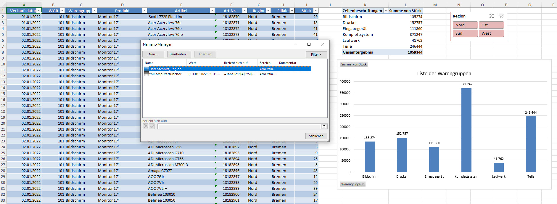 Eine Teilnehmerin der Excelschulung beschwert sich in der Excelschulung: Im Namensmanager werden intelligente Tabellen und Datenschnitte aufgelistet; nicht jedoch Pivottabellen und Diagramme.