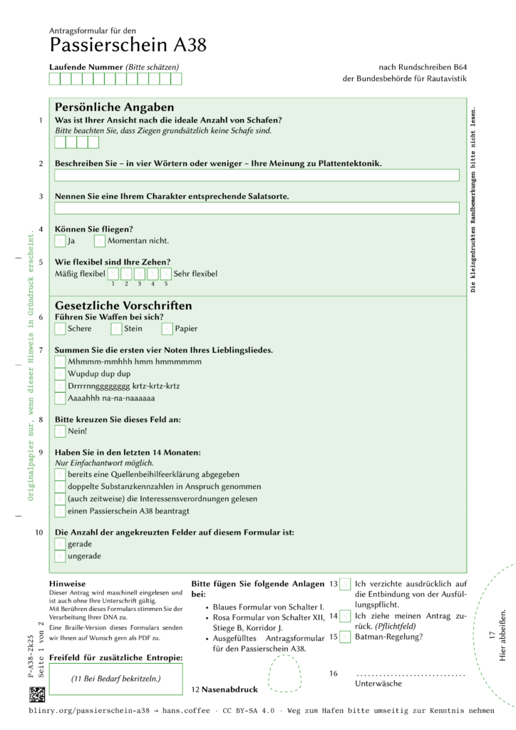 Den Passierschein A38 kennt sicher jeder, der Asterix (und Obelix) mag. Hans Schülein hat das ‚Antragsformular für den Passierschein A38‘ von blinry in einer modern gestalteten LaTex-Fassung auf GitHub bereitgestellt (CC BY-SA 4.0).