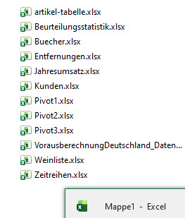 Wir haben seinen ganzen Rechner nach temporären Dateien durchsucht. Per Makro versucht die Dateien zu ermitteln. Sämtliche Add-Ins und Add-Ons deaktiviert. Rechner runter- und wieder hochgefahren. Excel ohne Datei geöffnet. Eine neue, leere Datei über das Kontexmenü auf dem Desktop geöffnet. Nichts gefunden; wird haben diese fünf Einträge nicht wegbekommen. Ich schaue bei mir zu Hause auf meinem Rechner nach – das gleiche. Auf einem anderen sieht es so aus: