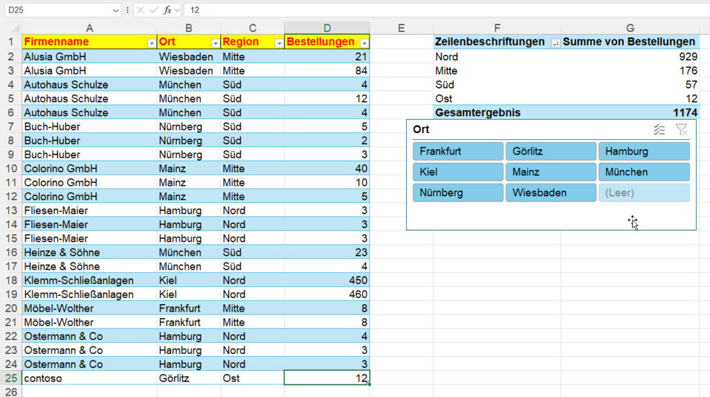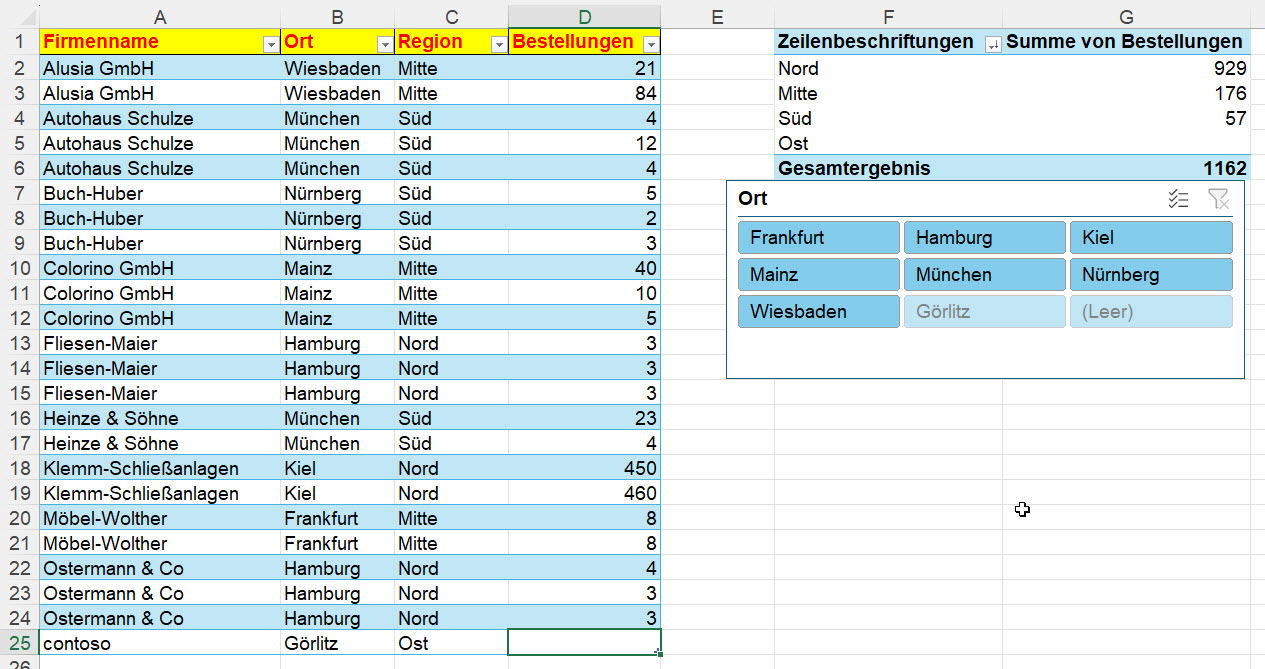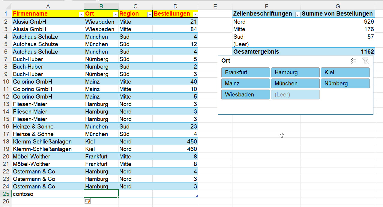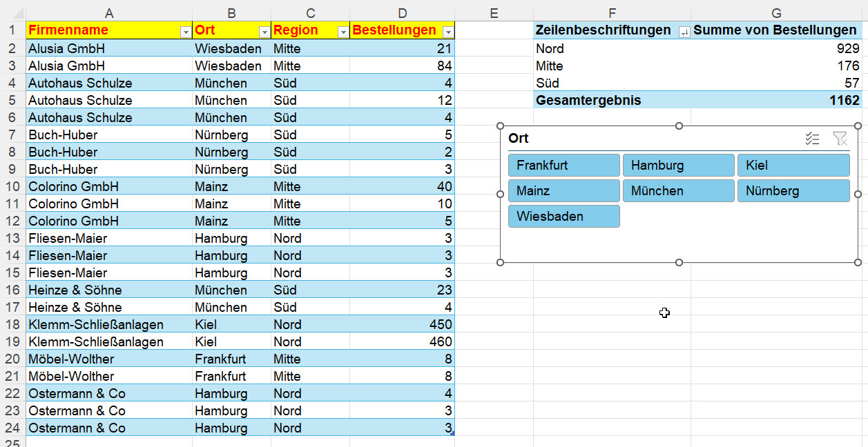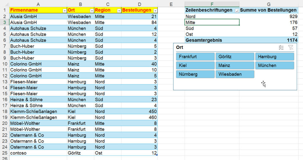Auf einer Liste, die als intelligente Tabelle formatiert ist, sitzt eine Pivottabelle mit Datenschnitt: