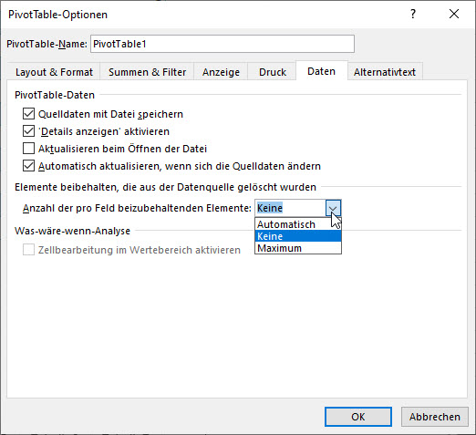 In den Optionen findet sich die Einstellung „Anzahl der pro Feld beizubehaltenden Elemente“. Sie wird auf „Keine“ gesetzt.