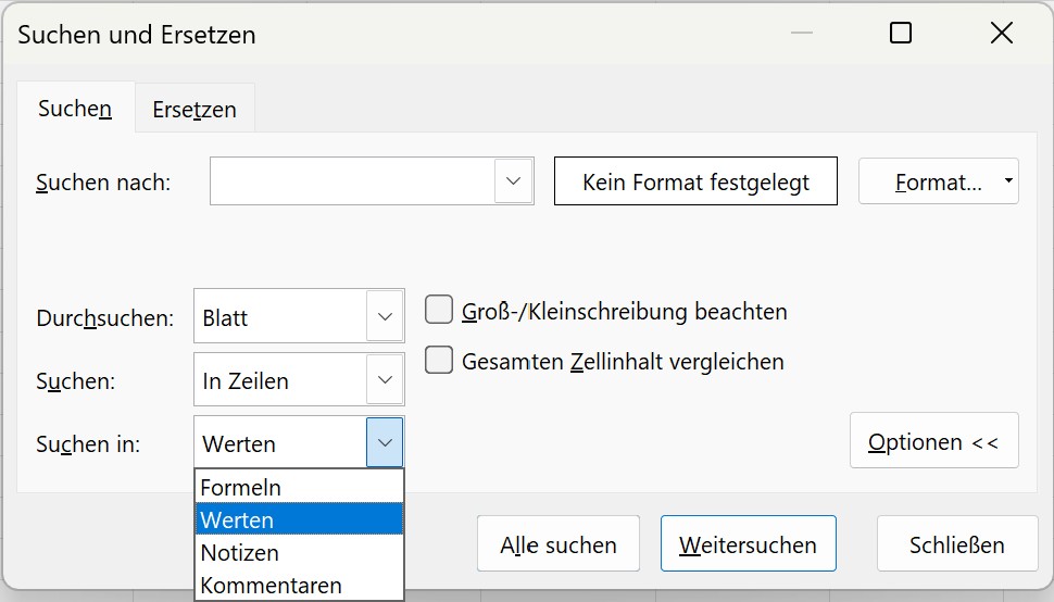 Frage einer Teilnehmerin in der Excelschulung: Warum findet mein Excel manchmal Texte nicht, die ich in das Suchen-Fenster eingebe?