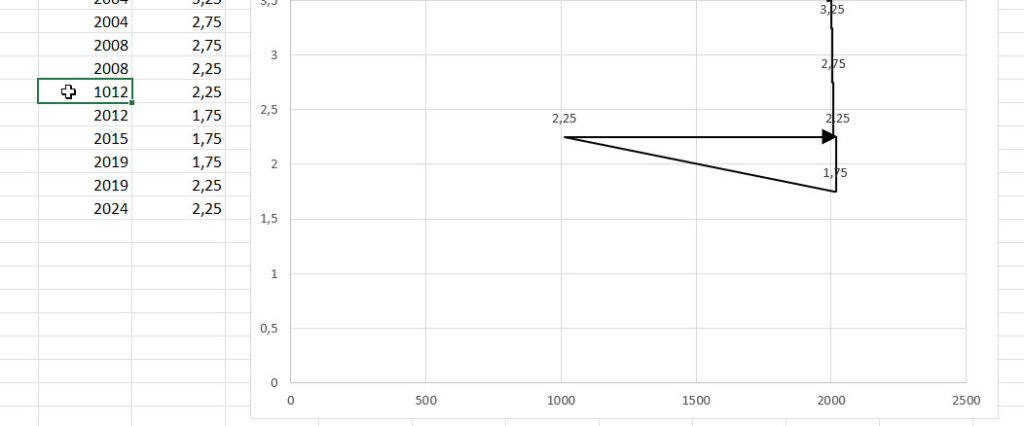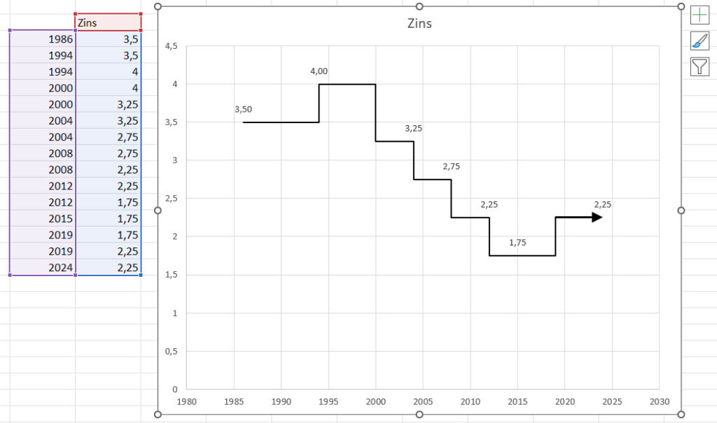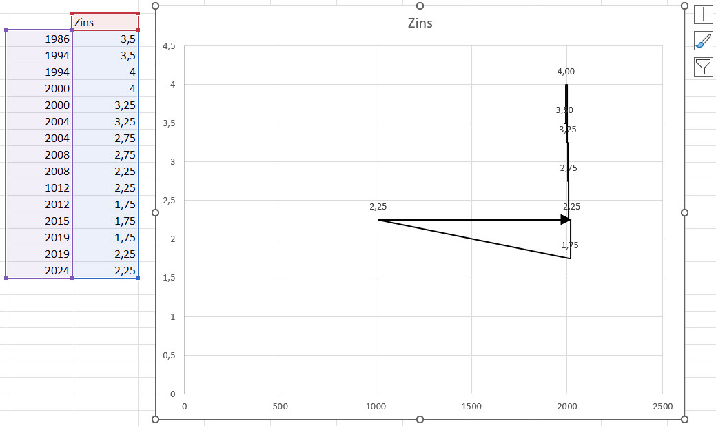 Excelschulung. Wir üben Diagramme. Die Aufgabe: ein Diagramm zu erstellen, bei dem die Linien waagrecht laufen, das heißt: den Wert von Punkt A bis Punkt B konstant behalten. Beispielsweise beim Zinssatz: