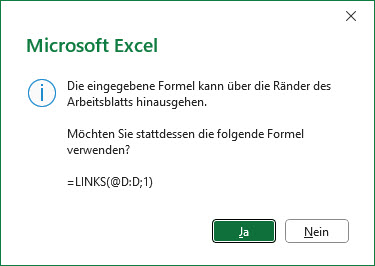 Klar: der Cursor befindet sich in E2. Die Formel versucht auf die ganze Spalte D zuzugreifen – damit „fehlt“ eine Zelle …
