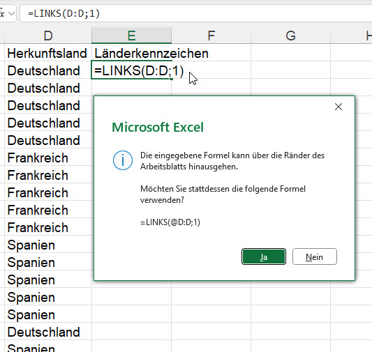 Excelschulung. Ich zeige, wie man mit der Funktion LINKS den ersten Buchstaben aus einem Text herauslöst. Beispielsweise, um aus dem Ländernamen das Länderkennzeichen zu generieren.