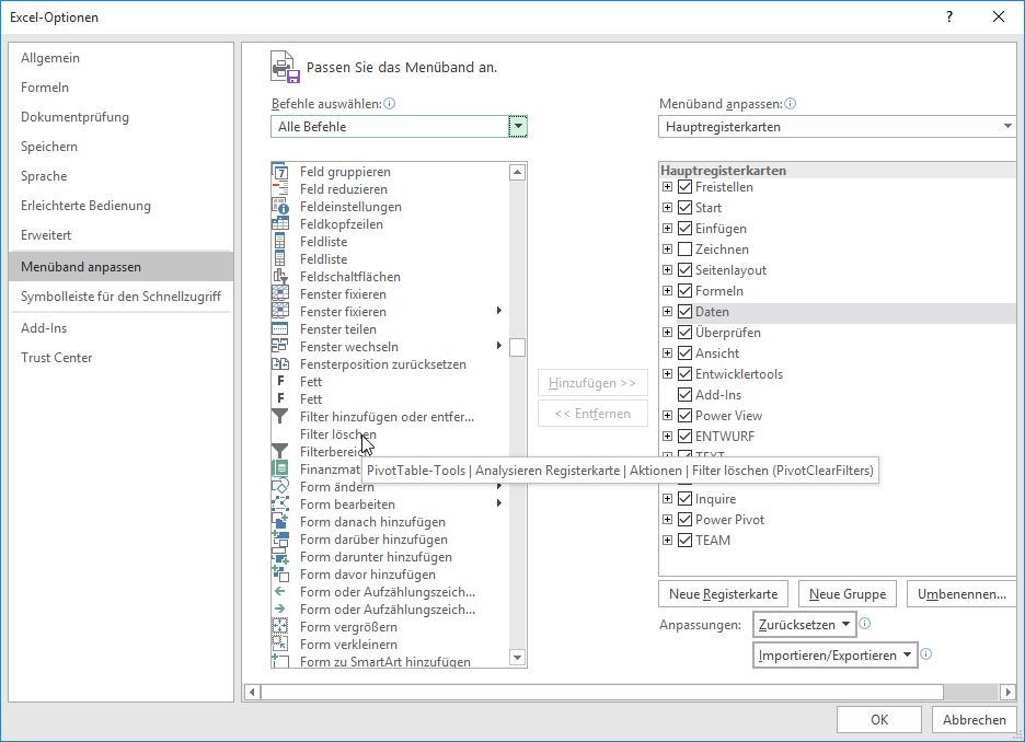 Die Antwort: Richtig – Sie haben das Symbol „Filter löschen“ hinzugefügt. Wenn Sie sich das Symbol in dem Optionen ansehen, so sehen Sie den englischen Begriff „PivotClearFilters“.