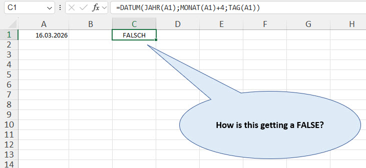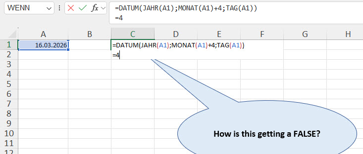 Warum ist die Formel „falsch“? Die Formel ist korrekt. Auch der Wert der Zelle A1 ist korrekt.